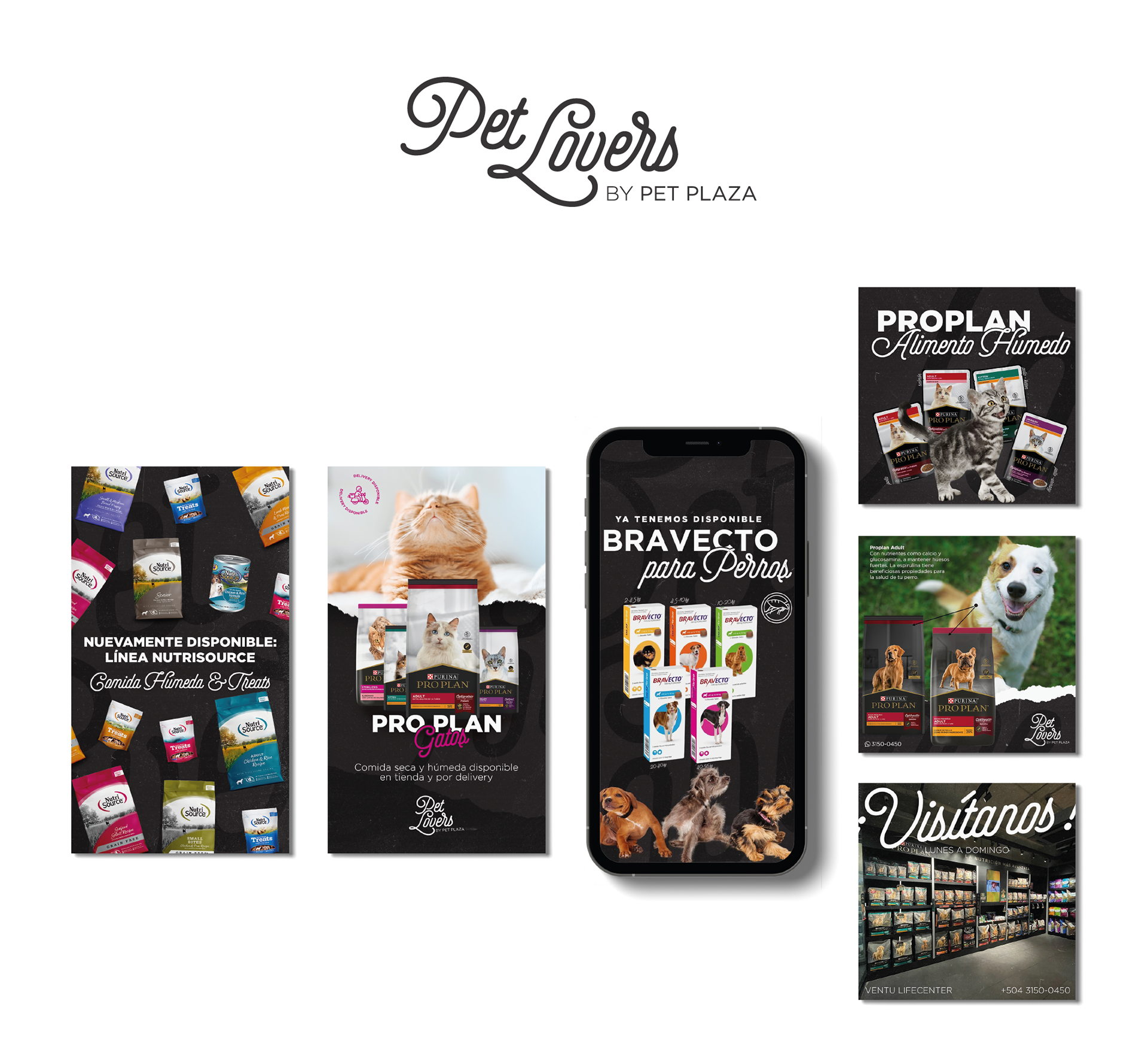 Manejo de redes sociales y la creación de contenido gráfico y audiovisual para tres marcas hermanas del sector de mascotas, enfocadas en servicios veterinarios, grooming, y la venta de alimentos y accesorios para mascotas.